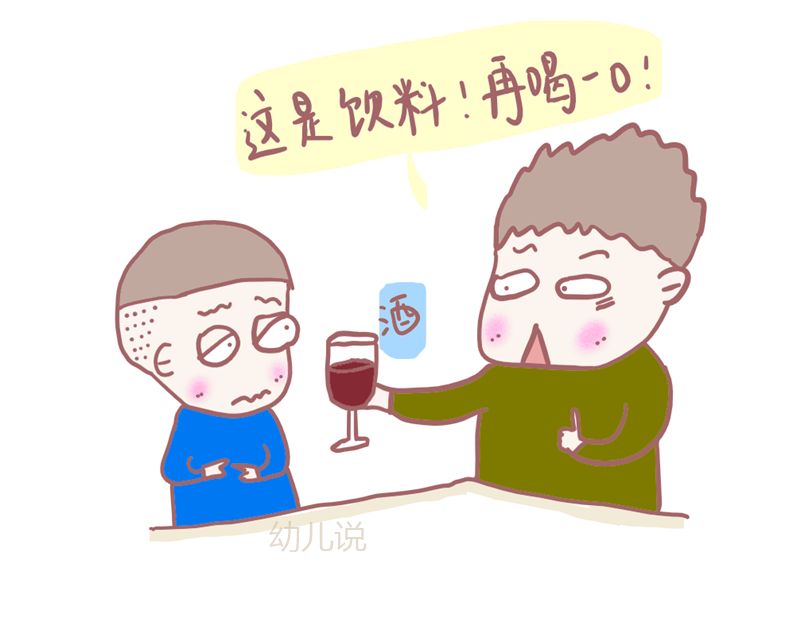 小胖小朋友家里来了很多客人,午饭前,爸妈还在厨房忙。一位叔叔拿着拿着装着红酒的酒杯跟小胖说:“这是饮料,要不要喝一口?”见小胖有些犹豫,叔叔继续晃着酒杯跟他说:“你看这饮料的颜色很好看,我在家里每天都喝的!”小胖被打动了,大大地喝了一口后才知道上当了,味道苦涩得他立即吐了出来。这时甚至有人说:“好笨的小胖,真的太好骗了!哈哈……”