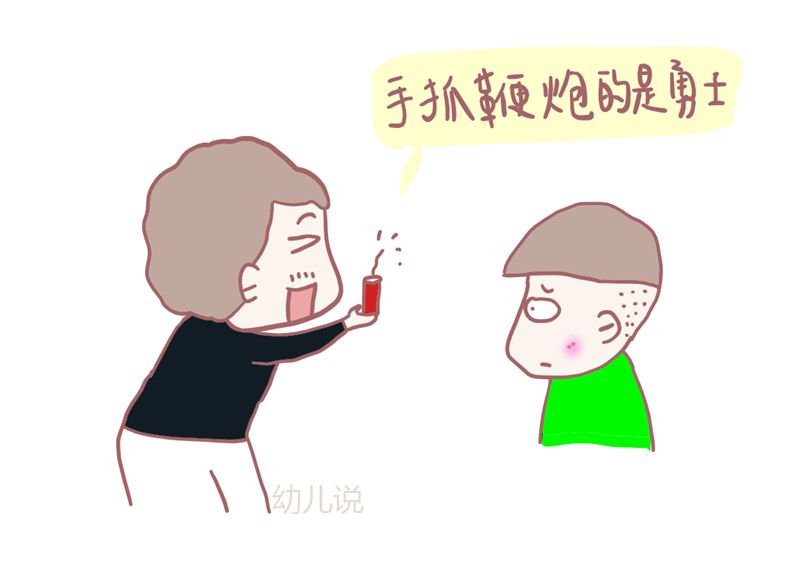一位妈妈亲眼目睹了儿子经历这一刻的惊险。一位亲戚自己点燃了一个鞭炮,然后递给她的儿子,一位6岁的小男孩,跟他说“手抓鞭炮的是勇士”,看着嘶嘶燃烧的导火索,这位妈妈的心提到了嗓子眼,一把抓起儿子就跑。身后的鞭炮“啪”一声炸了,被亲戚丢到仅1米处的地方炸了。她立即带儿子离开了亲戚家,倘若再来一次,她真的难以想象能不能再次抓起孩子就跑,太危险了!