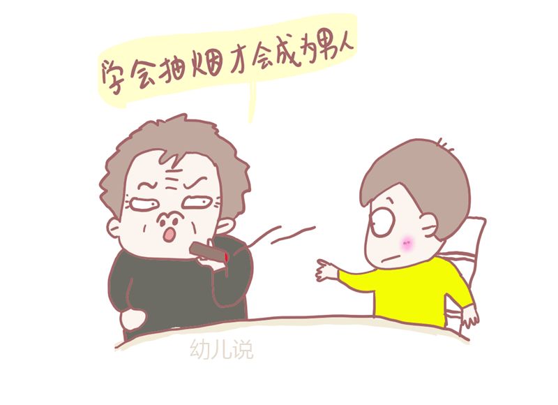 拜年时,几个男人在抽烟,一位伯伯点燃一支递给旁边的小男孩:“学会抽烟才会成为男人,否则你会变成女人!”小男孩困惑。这时伯伯又说:“你看你爸爸之所以是男人,是因为他学会了抽烟;你妈妈是女人,因为她从不抽烟!你这个年龄学抽烟最合适!”小男孩忐忑地接过香烟,学着别人的样子猛吸了一口,呛咳得眼泪都掉下来了。孩子手里抓着点燃的香烟,在呛咳中不小心还把自己身上的羽绒服烫破了一个洞,还烫到了自己的手指,立即冒起了一个水泡。孩子一边呛咳还一边痛得哭了起来。