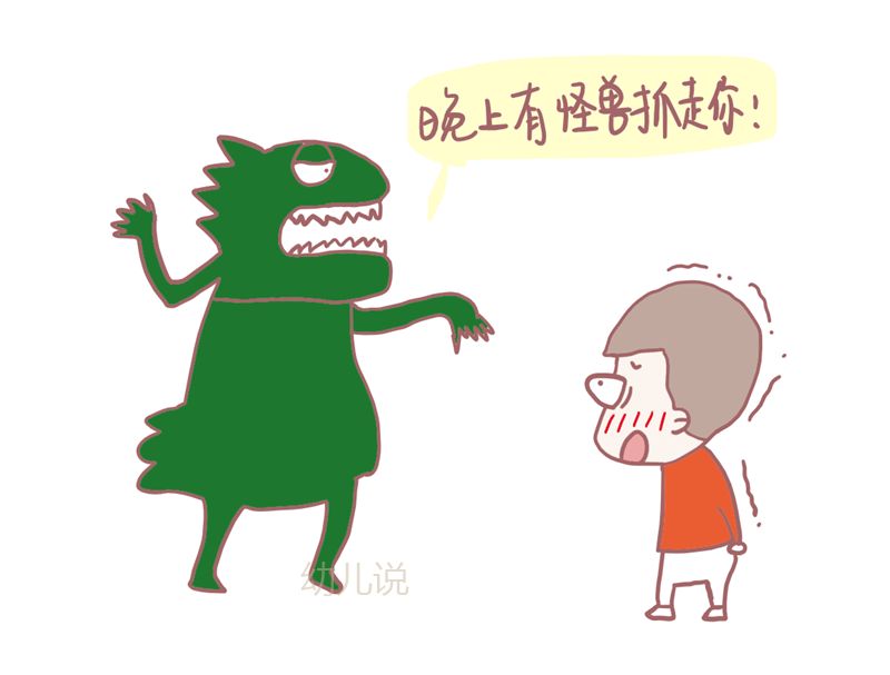为了让小男孩好好坐着,不要跑来跑去,亲戚家一位老人骗小孩说:“坐下来,好好吃零食!否则晚上会有怪兽抓走你!”小男孩瞪圆了眼睛,他的脑海在想象怪兽的样子,以及怪兽如何抓走他,最后怪兽还一口把他吞掉……太可怕了。小男孩不敢跑了,而是坐下来,不敢吃零食,动也不敢动。