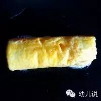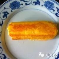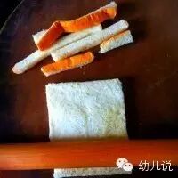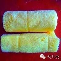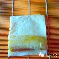 5、为了增加粘性,可以将吐司包裹的那面涂上蛋液,然后用吐司把香蕉卷起来;