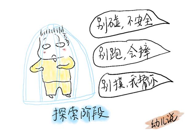 在探索阶段的伤害,一般家庭常常表现在这些方面:一些大人因为害怕孩子出意外,限制孩子做这个做那个,过于谨小慎微,孩子稍微做出一点探索,大人就会过于紧张或大惊小怪呵斥。那么养出来的孩子毫无疑问也是谨小慎微,不轻易探索,缺乏创造力和想象力的,最终成为保守的甚至是木讷的毫无生机的孩子,最严重的,孩子会自我封闭。