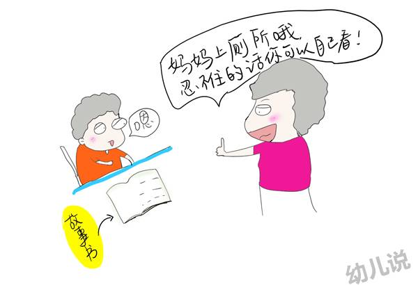有一天,小屏妈妈给女儿讲《三只小猪》的故事,讲到大灰狼到猪老三的门口敲门时,小屏妈妈故事放下书上厕所,离开前不忘记叮嘱女儿:“妈妈可能比较久,你如果想快点知道大灰狼能不能进屋,你可以自己看”。小屏本来听到津津有味,被妈妈这一中断很沮丧,妈妈离开没多久,她便迫不及待地自己拿起了书看。