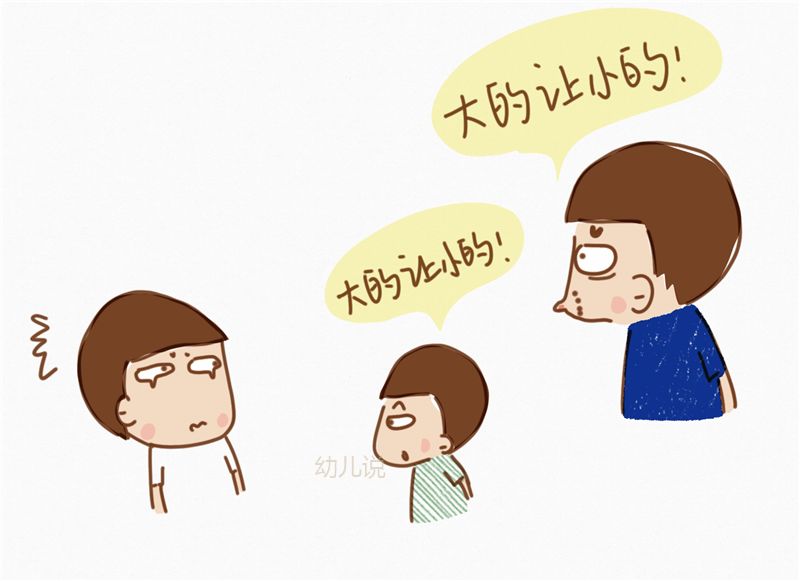 “大的让小的”其实是大人想当然的想法。小孩子如果总得到家里最好的资源,大孩子总要把最好的让给弟弟或妹妹,大孩子可能会感受到被父母“不待见”。他们可能会觉得,“爸妈更爱弟弟”,“妈妈不爱我了”,“我不够好,所以没人爱”……不仅安全感下降,自尊感也会下降。