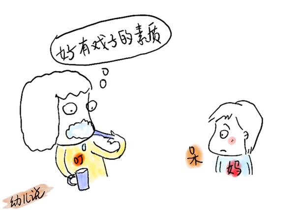 “叮当”躺床上发呆,就是不愿刷牙,“妈妈”叉着腰装作生气的样子,指责孩子拖拉、不懂事(汗!我平常这么粗鲁吗?)
