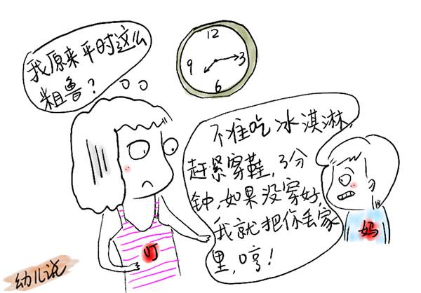 “哦哦,不准吃冰淇淋,赶紧穿鞋,3分钟,如果没穿好,我就把你丢家里了,哼!”(汗颜,我平时这么粗鲁?)