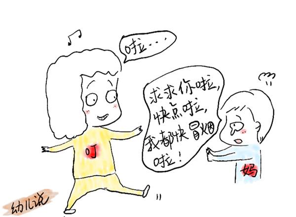 “叮当”穿衣服又在发呆,“妈妈”:“你快点啦,我都快冒烟啦!”