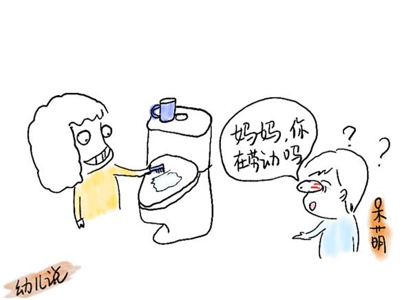 “叮当”终于慢吞吞地进入洗手间,刷牙的时候却刷起了马桶,“妈妈”懵了:“妈妈,你在劳动吗?”(呆萌间变回叮当。)