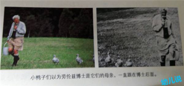 “刻印”最早是由奥地利生物学家康拉德.劳伦兹提出来的,他曾经做过一个有趣的实验。他把鸭蛋分成了两组,一组由母鸭孵化,这组鸭宝宝出生后第一眼看到的是鸭妈妈;第二组鸭蛋由人工机器孵化,劳伦兹让鸭宝宝们第一眼看见的是他。随后,他将这两组鸭宝宝放在同一个笼子里惊吓他们,鸭宝宝惊得乱窜,当打开笼门那一刻,被做了标记的第一组鸭宝宝第一时间冲到了鸭妈妈身旁,而第二组鸭宝宝冲到了劳伦兹身旁。更有趣的是在日后的生活中,无论到哪里,第一组鸭宝宝总是追随在鸭妈妈身旁;而第二组的鸭宝宝,无论劳伦兹走到哪里便跟到哪里。劳伦兹在第二组鸭宝宝心里做了“刻印”,它们把劳伦兹当成了妈妈。劳伦兹认为,动物身上有一种“刻印”机制,对刚出生后看到的事物能产生强烈的连带感。