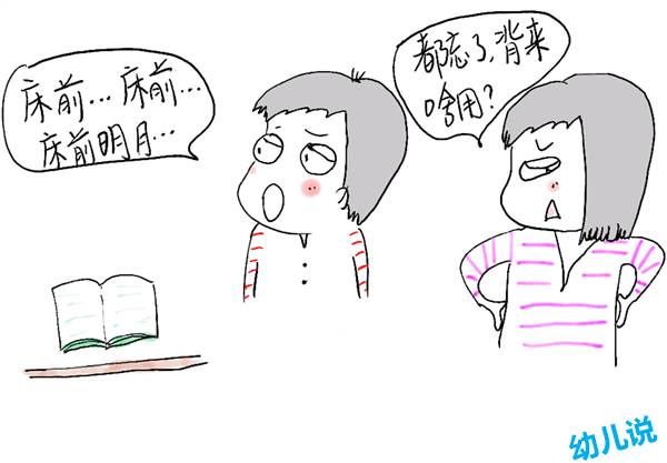 在幼儿园的一次家长开放日,老师说我儿子背《静夜思》很快,一开始一点也不会,老师教了3遍就会了,让老师们很惊讶。还要让儿子在家长开放日当场背诵,我毫无心理负担,因为儿子几个月开始,我便经常给他读古诗,他背《静夜思》很快也是理所当然。如果其他小朋友上学前有背过,相信再记忆的速度也不会慢。