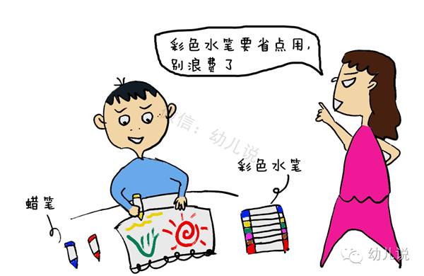 F妈有一奇葩往事,她7岁的儿子说想画画,她便一咬牙给孩子同时买了彩色水笔和蜡笔,心想如果儿子哪天成为大画家,这点钱还是不能省的。但回到家后,看到儿子兴高采烈地用彩色水笔画着,F妈竟然嘴贱地跟儿子说:“不要浪费水笔,要节省着用,不要一下子涂完了!”(当然是无意识的,葛朗台第二),结果孩子听话地将彩色水笔收起来,只用蜡笔,而彩色水笔一直放着直至干化再也没动过。