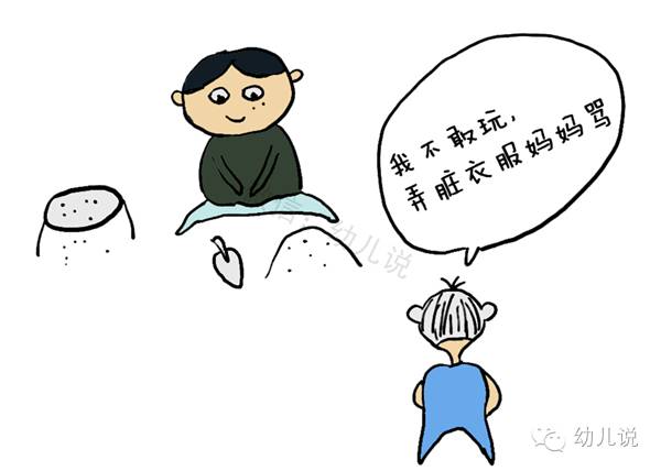 某天带孩子到沙池玩,沙池里好几个孩子玩得正欢,有人在堆砌城堡,有人在堆小汽车,唯独A妈的3岁儿子一直手搓着蓝色上衣一言不发地站在沙池边上,但眼睛注视着沙池里的孩子,脸上的表情已经沉浸在他们的欢乐里。一个热情的小朋友过去拉他的手,邀请他一起玩,没想到他不好意思地摇摇头:”不玩了,会弄脏衣服,妈妈骂!““懂事”得让人心疼,不远处A妈在刷着手机。