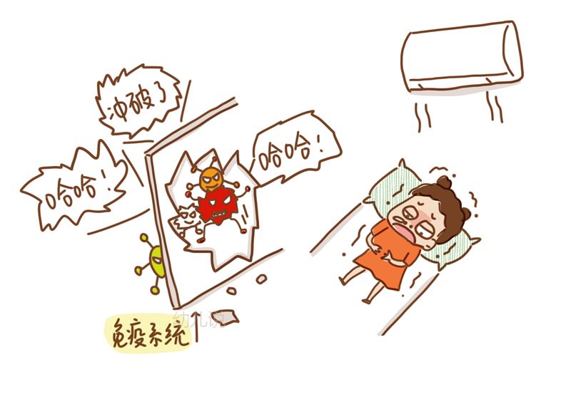 当孩子在空调房里受冷,身体的免疫系统变得脆弱,身体或环境中的细菌就容易“攻破”身体的免疫系统,那么孩子生病或感冒症状就容易出现了。