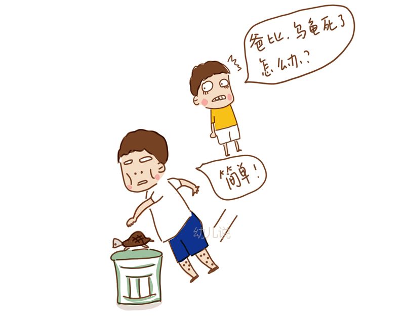 一位小男孩的乌龟死了,伤心地不停问爸爸怎么办。