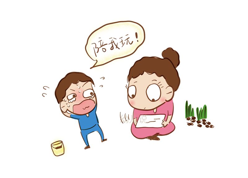 公园里,一个小男孩拽着妈妈的手哭闹:“妈妈陪我玩。”妈妈眼睛一边盯着手机屏幕,一边伸手往手提包里拿出零食给孩子吃。孩子一开始犹豫地看着妈妈,似乎在想“我还要玩沙子呢”。