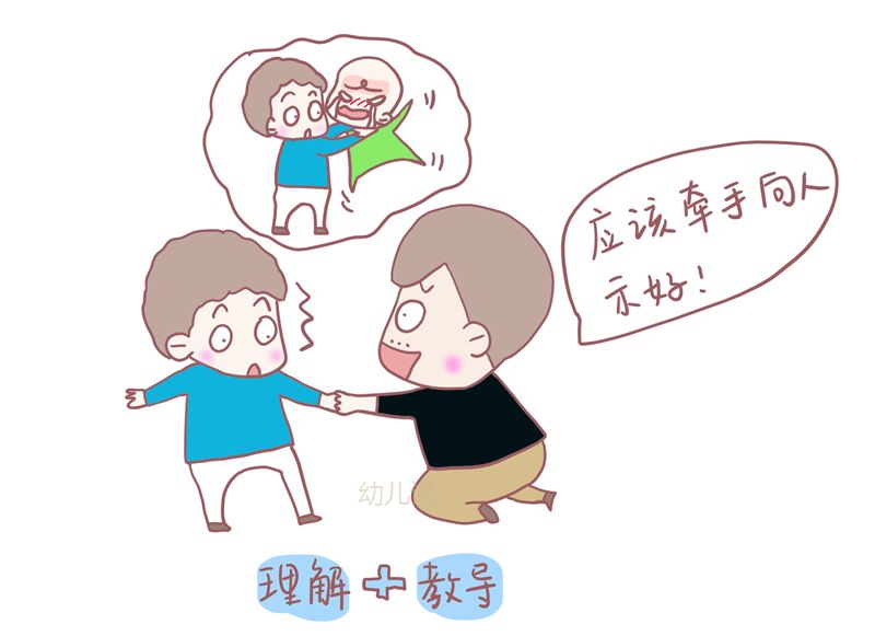 在排除了孩子的故意动机外,父母正确的做法,应该是理解孩子的行为,及时阻止,并且给予正确的行为示范。比如分享玩具时,应该把玩具放到对方手上,而不是砸到对方头上;又比如跟小朋友示好时,可以牵牵对方小手,而不是把对方勒到气绝。