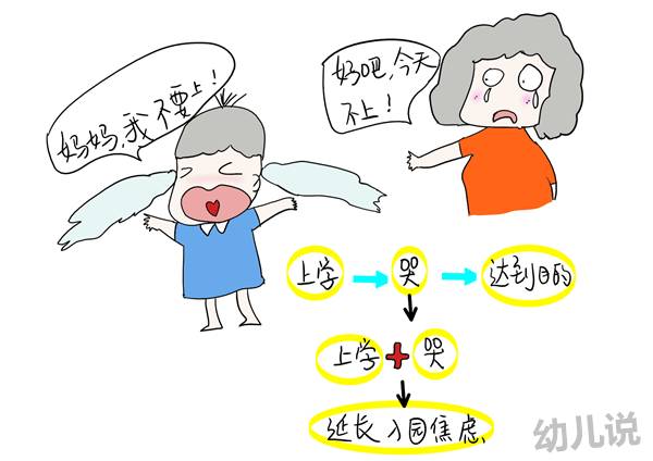 因为长期的经验告诫这些老师们,父母这一逗留或仁慈,会给孩子建立了一种行为模式:孩子哭闹——父母心软——孩子哭闹更厉害——父母无奈领回家/父母迟迟逗留,孩子第二天便继续同样的模式,最终导致“入园焦虑期”无限延长,不仅孩子痛苦,父母揪心,老师面对的是一个越来越顽固的孩子。