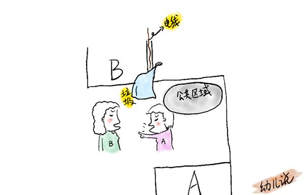 同一栋楼里,还有这样的两户人家,两家的大门是面对面的。年初二一大早,A户的妈妈敲开了B户妈妈的门,当B妈妈一开门,A妈妈就劈头盖脸地骂,说对方霸占了她家的“地盘”。B妈妈出门一看,原来自己刚丢的垃圾袋轻轻倾斜,稍微越过了电线杆,她赶忙一边说对不起,一边把垃圾袋扶正。A、B妈妈这段小插曲,没多久被同一层楼的快嘴王大妈传遍了整个小区。