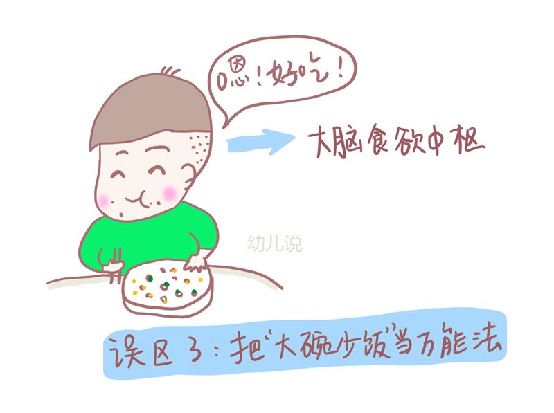 “大碗少饭”的心理法,只能当作辅助手段。正如我在“别逼孩子吃饭:大脑的食欲中枢决定孩子想吃多少”一文提到,孩子大脑的食欲中枢决定了孩子的进食量。当然,身体对能量的消耗也会影响孩子的食欲中枢,继而影响孩子的进食量。当孩子随着身体的发育成长,消耗的能力提高,大脑食欲中枢决定孩子的进食量也会增加。
