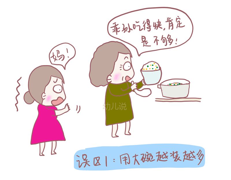 有些妈妈看到孩子用大碗很快吃完,便觉得孩子可能吃不够,或者认为孩子吃更多会更好,在短暂的时间内一下子加大孩子吃饭的分量,饭食在大碗里的比例一下子提高,这是不可取的。一方面,迅速加大吃饭量、暴饮暴食不利孩子的肠胃消化和健康;另一方面,饭食在大碗里的比例提高,就达不到“大碗少饭”给孩子带来的视觉和心理效果。大碗满满的饭跟小碗满满的饭,同样会引起孩子饱饱的感觉,食欲和容易战胜的感觉便一下子没了。
