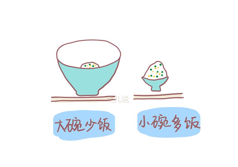 幼儿说前段时间分享了“别逼孩子吃饭:大脑的食欲中枢决定孩子想吃多少”一文后,收到一些爸妈留言说自己的孩子真的吃得很少,食物量只有其他小孩的一半或更少。所以,今天幼儿说会从心理学的角度给爸妈们支招,父母不用训不用教,一个简单的小改变,就能帮助孩子的食欲“静悄悄”地提升——“大碗少饭”法则!简言之,就是用大大的碗装上孩子平时的饭量。看看图,对比一下:
