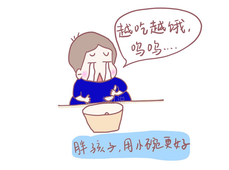 我曾经遇到一位肥胖的小男孩,小家伙年龄还没够5岁,体重已经接近100斤。小男孩的妈妈说,孩子以前每一顿要吃一个普通小孩3倍的饭量,现在她为了让孩子少吃多餐,慢慢减肥,每一次的饭食量只有一个普通小朋友一半的饭食量。但小胖墩说:“越吃越饿!”看到家长给孩子用的饭碗我便笑了:妈妈还在使用小胖墩以前用的大饭碗,大大的饭碗装着可怜兮兮的饭量。小男孩委屈地说:“每一次只吃了几口就没了”。我建议小男孩的妈妈用一个小碗给孩子装饭,让孩子从心理上会更容易接受一些。小男孩的妈妈后来说:“给他换了小碗后,再也没说饭太少了!”