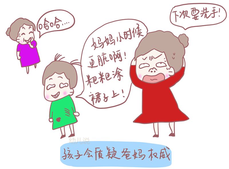 曾经有妈妈跟我说,某天批评女儿吃完奶油蛋糕直接往身上擦手的坏习惯,她要求女儿下次要去洗手而不是涂身上。这时姥姥在一旁说:“你小时候比妞妞更脏,你拉粑粑每次都不让擦,直接粘裙子上……”她的女儿“哈哈”大笑,说“妈妈是脏小孩,自己也可以教妈妈做事……”之类的话。她感觉自己的妈妈形象被老母亲毁掉了。