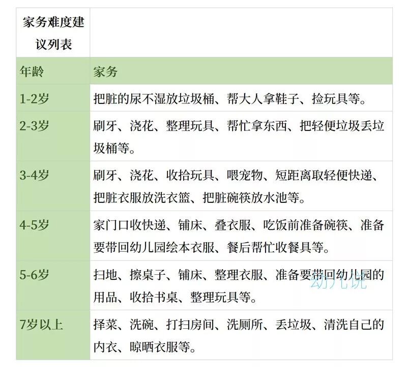不同年龄的孩子适合不同难度的家务活,下面大家可以参照一下: