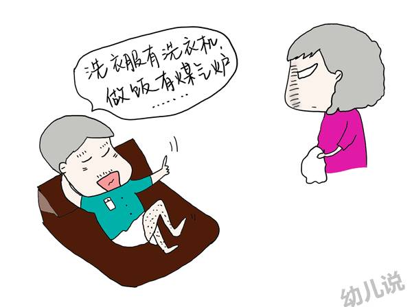 这个家庭的妈妈不仅上班,家里的家务和照顾孩子都是妈妈一个人。爸爸只管上班,还认为自己劳苦功高,他对妻子的口头禅是:“别跟我说你做家务累,衣服有洗衣机、做饭有煤气炉、扫地有吸尘器,你做家务能有多累!”因为爸爸,这个家庭的儿子也不尊重妈妈的劳动,也从没帮妈妈做过一点家务,“衣服有洗衣机、做饭有煤气炉”也变成了儿子的口头禅。