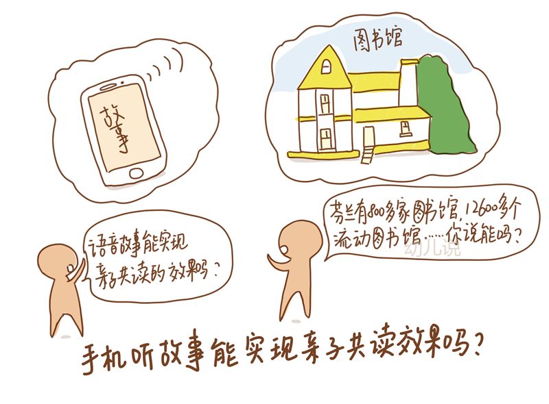 在看到这些父母的问题时,我总会想到一个情景——芬兰是世界上图书馆密度最大的国家,才500多万人,便有800多家图书馆,12600多个流动图书馆,甚至每位宝宝一出生就会收到育婴部门的亲子阅读的启蒙绘本,这也是宝宝人生的第一本书。芬兰的父母也重视亲子阅读,在家里不仅设置阅读区,每晚还有家庭阅读时间……为什么人家要如此大费周章?打开手机听一听语音故事不就解决了?答案也是否定的。