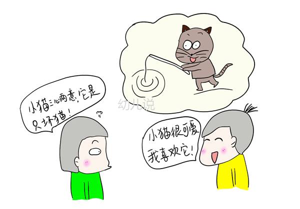 小丫开心地说:“小猫毛茸茸的很可爱,我喜欢小猫。”大丫很生气的样子:“我才不喜欢小猫,钓鱼三心两意,它是一只坏小猫!”大丫的妈妈常常在亲戚面前批评自己的女儿坏毛病很多,是个不听话的孩子;而小丫的妈妈对女儿较为宽容,能一分为二地分析自己女儿的优点和缺点。