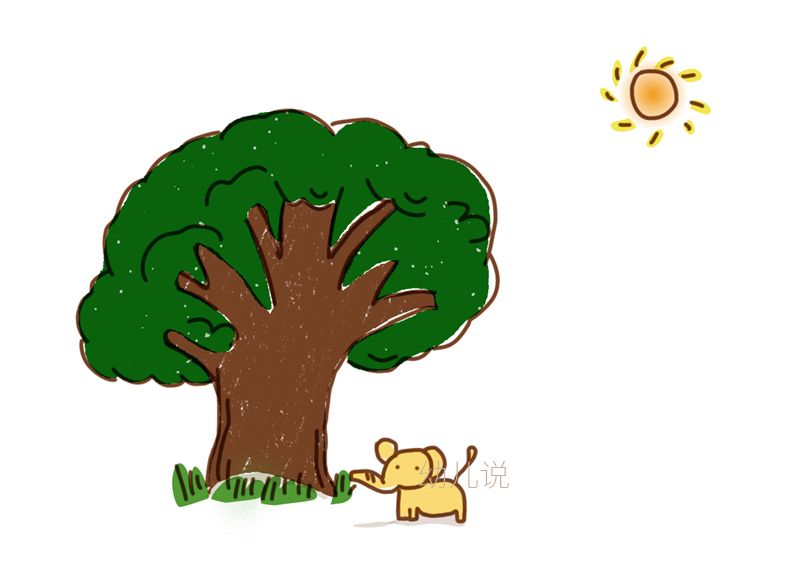 在小河与大海的汇聚处,岸边长了一棵硕大无比的大树,大得需要五头大象围起来才能把那棵大树包围,连象群里力气最大的大象都难以撼动。