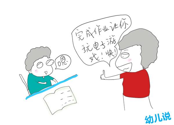 客厅里,一位光头小男孩时而瞪着面前的墙壁发呆,时而趴在书桌上玩橡皮擦。他面前的作业本,只写了最前面一行的两个字。这时小男孩的妈妈从房间出来,大概看出了孩子的磨蹭:“赶紧写作业,写完让你打一场电子游戏作为奖励。”