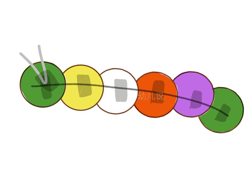 步骤3,剪一根短细绳,摆成“V”状,用双面胶贴在毛毛虫头部的圆圈上,制作成毛毛虫的触角。