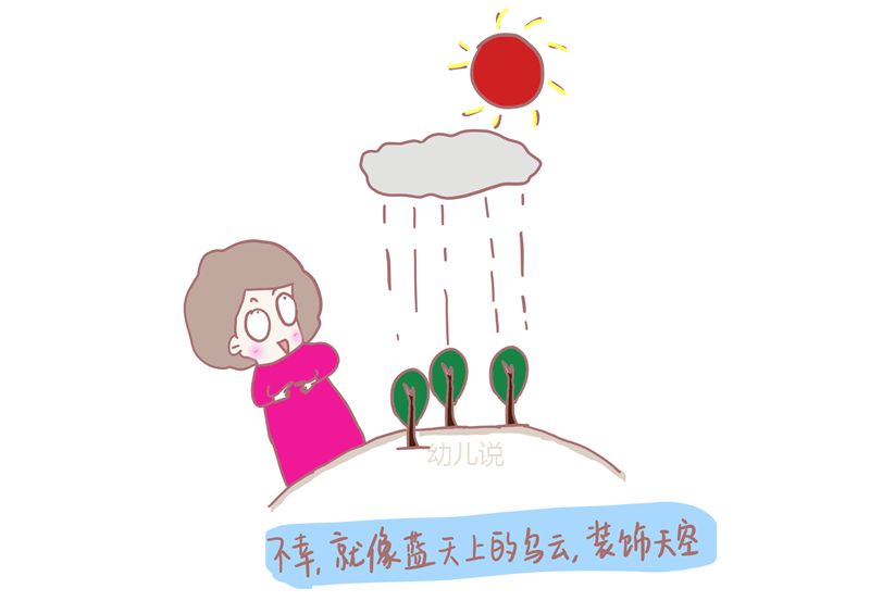 我:“不要害怕人生不幸!不幸,就像天上的乌云,能装饰蓝色的天空;不幸,也像画纸上的小污点,能变成画中小人儿黑黑的小小眼睛;不幸,也像你有一次手拿零花钱一个人买早餐,丢了钱空手回家,第二次你便懂得把钱放在裤袋里……”