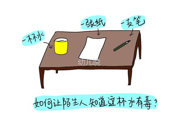 在一个课堂上,老师拿出一杯水、一张纸和一支笔,当然,讲台下的孩子也每人一套。接着,老师给孩子们出了一个这样的问题:如何让一个陌生人知道这杯水是有毒的?你有什么简单方法?