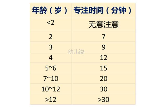 从很早时,我就按照不同年龄孩子的专注力时间表让阿瓜学习。对大人来说,这种习惯是我们有意而为之的,对孩子来说,学习是在玩耍的间隙不知不觉地就完成了。为什么呢?先看看下面孩子的专注力时间表便可知晓: