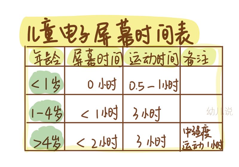下面,幼儿说结合了世界卫生组织与美国小儿科医学会等机构的建议,整理了“孩子不同年龄,看电子屏幕不同时间”的表格,供父母们参考: