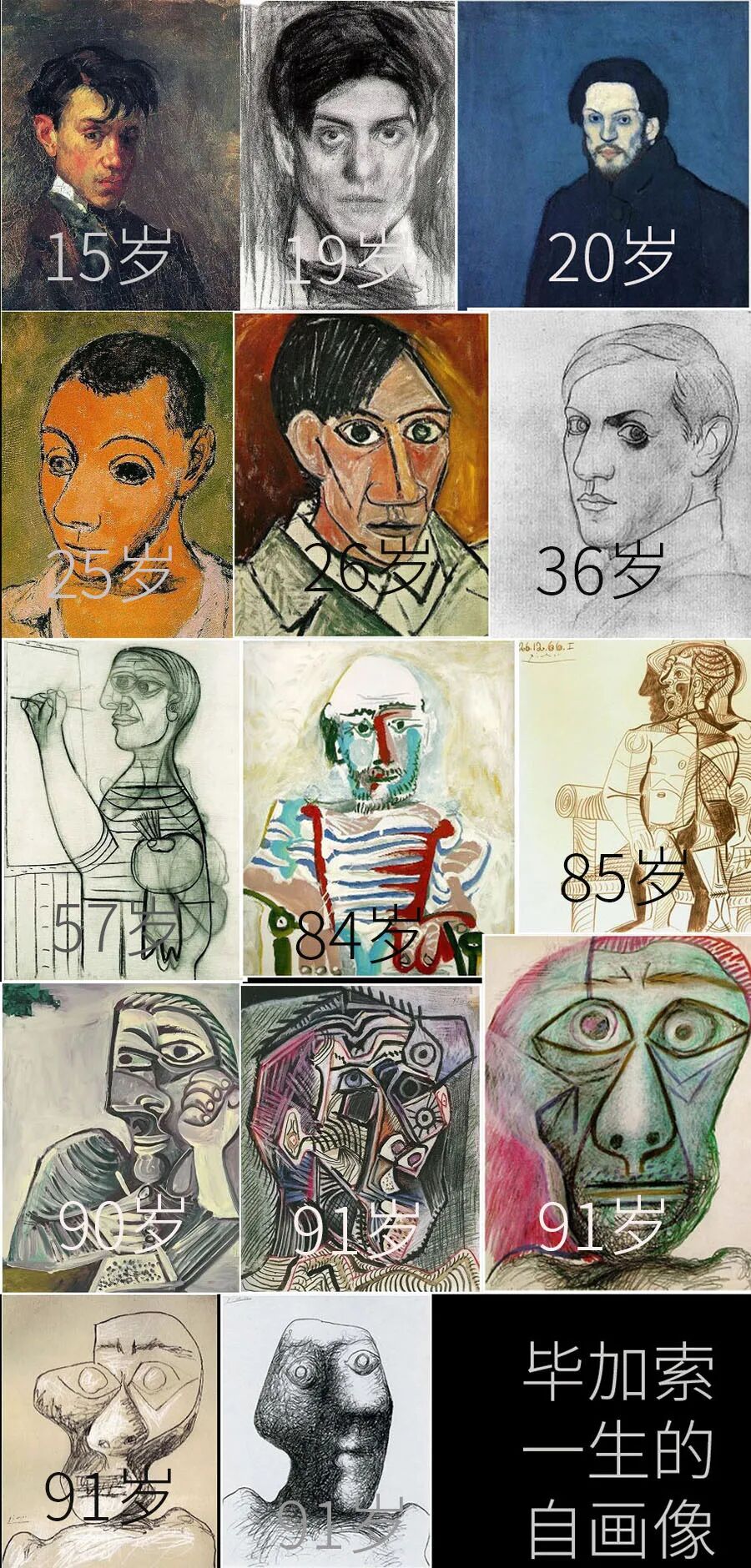 正如天才画家毕加索说过:“我能用很短的时间,就画得像一位大师;却要用一生的时间,去学习像孩子那样画画。”可想而知,孩子的创造力和想象力多么珍贵。毕加索的这句总结,也在自己一生的自画像中体现得淋漓尽致: