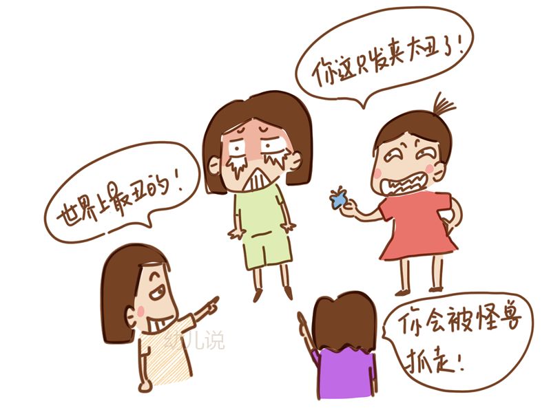 听到同伴们都这么说,红衣小女孩上前一抓,把小女孩头上的蓝色发夹扯了下来,蓝发夹小女孩被突如其来的抢夺吓得“哇”一声大哭起来。其他小女孩一边抢着看发夹,还一边对痛哭的小女孩骂:“丑八怪!”