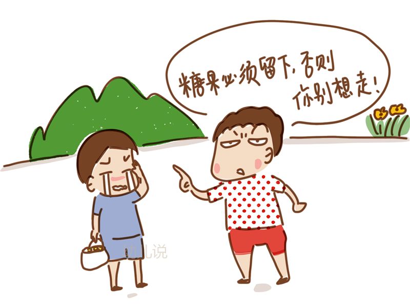 一次幼儿园郊游中,一位绿衣小男孩从书包里拿出一包薯片,打开后一片片往自己嘴里送。这时,一位粗壮的小男孩跑过来伸手就抢,两人在争抢中,粗壮小男孩把薯片袋子扯烂,薯片哗啦啦撒了一地……看到绿衣小男孩哭闹,粗壮小男孩还瞪眼睛嘲笑:“小气鬼,不分享还哭?”