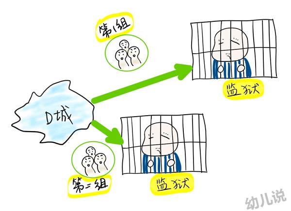 实验人员召集一群来自D城的人,并且任意分成1组和2组。接着跟他们讲了一个故事,说的是E地的一个监狱有个坏人,仅靠手上一根离地面距离一半长的绳子逃跑成功了,他到底是怎么做到的?