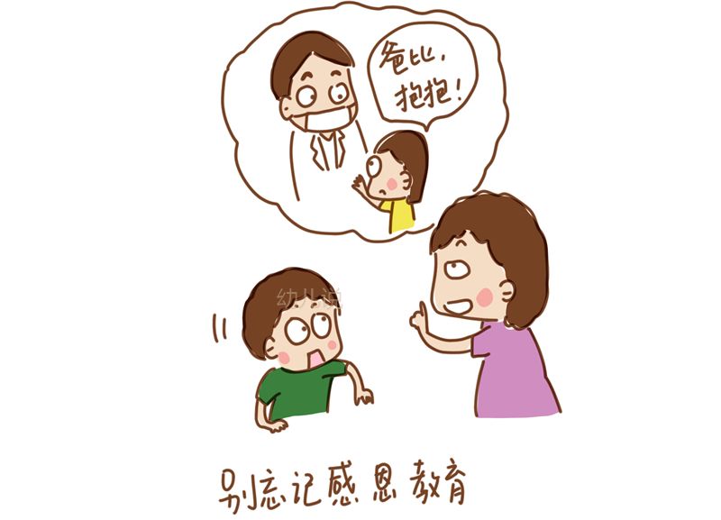 我说:你看啊,医生冒着生病的危险,每天给无数小朋友看病,帮助小朋友打败病菌。并且,这些医生叔叔或阿姨们,他们家里很可能也有一位跟你一样大的小孩子,一不小心就会生病。这样的叔叔阿姨,是不是值得我们喜欢呢?