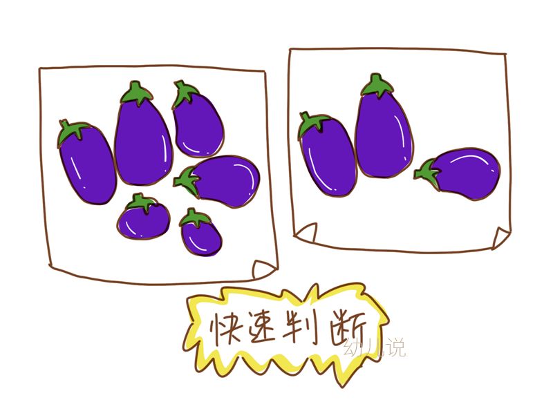 如果你觉得具体物体过于局限,你可以用图片让孩子判断,图片判断适合年龄稍大的孩子,例如3,4岁后。举个例子,一张图上有6只茄子,另一张图有3只茄子,给孩子快速展示后迅速盖上,让孩子判断哪张图的茄子多一些。