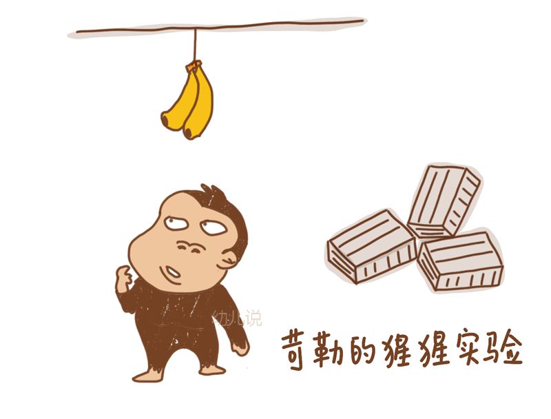 他们在一个空的实验室的天花板上,挂了一串香蕉,然后在墙边放了几只箱子,接着把一只大猩猩“请到”了实验室。大猩猩看到天花板上的香蕉,便伸手抓,跳了跳也没抓到。够不着怎么办呢?这只大猩猩开始在房间内走来走去,并四处观察。突然,它在墙角的几只箱子前停了下来,没多久便把一只箱子推到了香蕉下,踩到了箱子上。当它发现伸手仍旧够不着,便走下来推多了一只箱子,叠在原来的箱子上……一直抓到香蕉才停下来,美美地把香蕉吃掉。