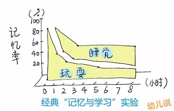 当一个孩子学习完之后睡觉,这个孩子对学习的记忆率始终维持在50%左右,而如果孩子学习完之后继续清醒或玩耍,他对学习的记忆率在8小时后掉到了10%以下。