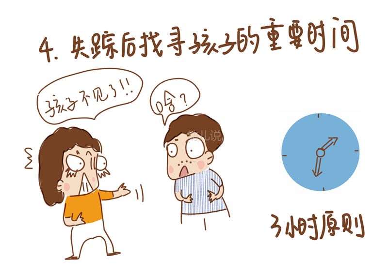 请遵循“3小时原则”。美国儿童保护中心曾经有数据表明,76.2%失踪的孩子是在3小时内遇害的。