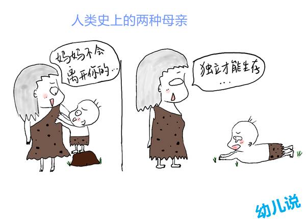 一种是离不开孩子型的原始人母亲(时刻关注保护孩子),一种是让孩子自生自灭型的原始人母亲,结果后一种孩子的生存率极低,最终被自然界抛弃,而繁衍下来的,都是一群离不开孩子型的母亲。(不过待娃儿们到能够独立生存,放手是母亲们的一种智慧。)