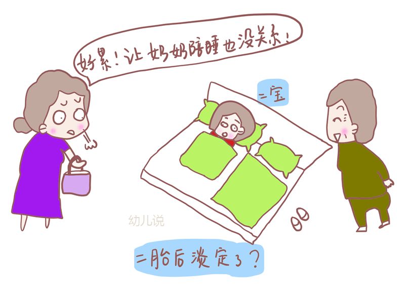 陪睡。一胎时,陪宝宝睡觉,大多数爸妈尤其是妈妈要亲自来,他们觉得“爸妈要陪宝宝睡才能保证安全感”;二胎时,不少爸妈淡定了:“偶尔让宝宝跟奶奶睡睡,也没多大影响呀”。