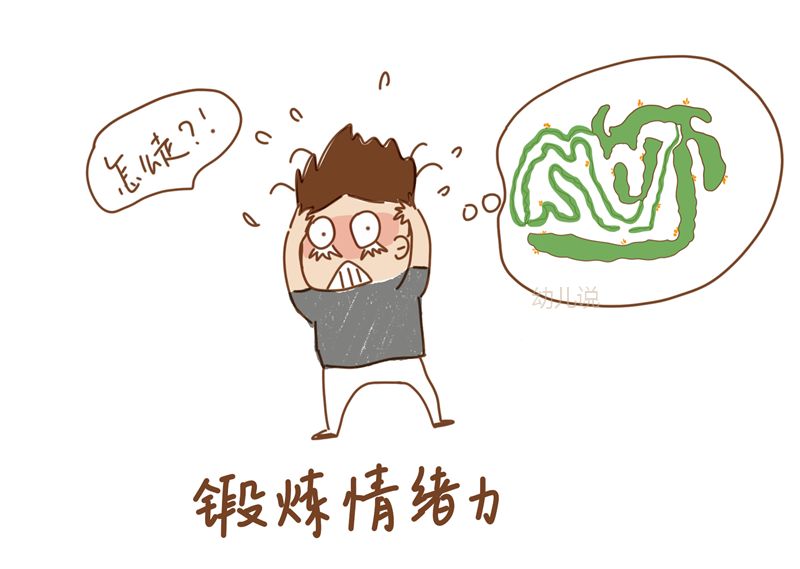 当一个孩子在迷宫中找不到出路时,焦虑和着急会让一些孩子愤怒,继而崩溃大哭。所以走迷宫不仅能看得出一个孩子的情绪力状况,在父母的正确引导下,还能锻炼孩子的情绪力。当孩子出现愤怒时,比如有些父母会告诉孩子“愤怒会让困难变大”,就像美国纽约大学临床心理学博士盖伊.温奇曾经分享的一个踢球门实验,当人经历挫折或失败时,不良情绪会让孩子从内心里觉得球门似乎变小了。对走迷宫的孩子也是同样的道理。当一些孩子走不出迷宫时,如果以负面情绪应对,会加大孩子内心对困难的压力。当父母正确引导,帮助孩子以合适的情绪对待,能锻炼孩子的情绪力。